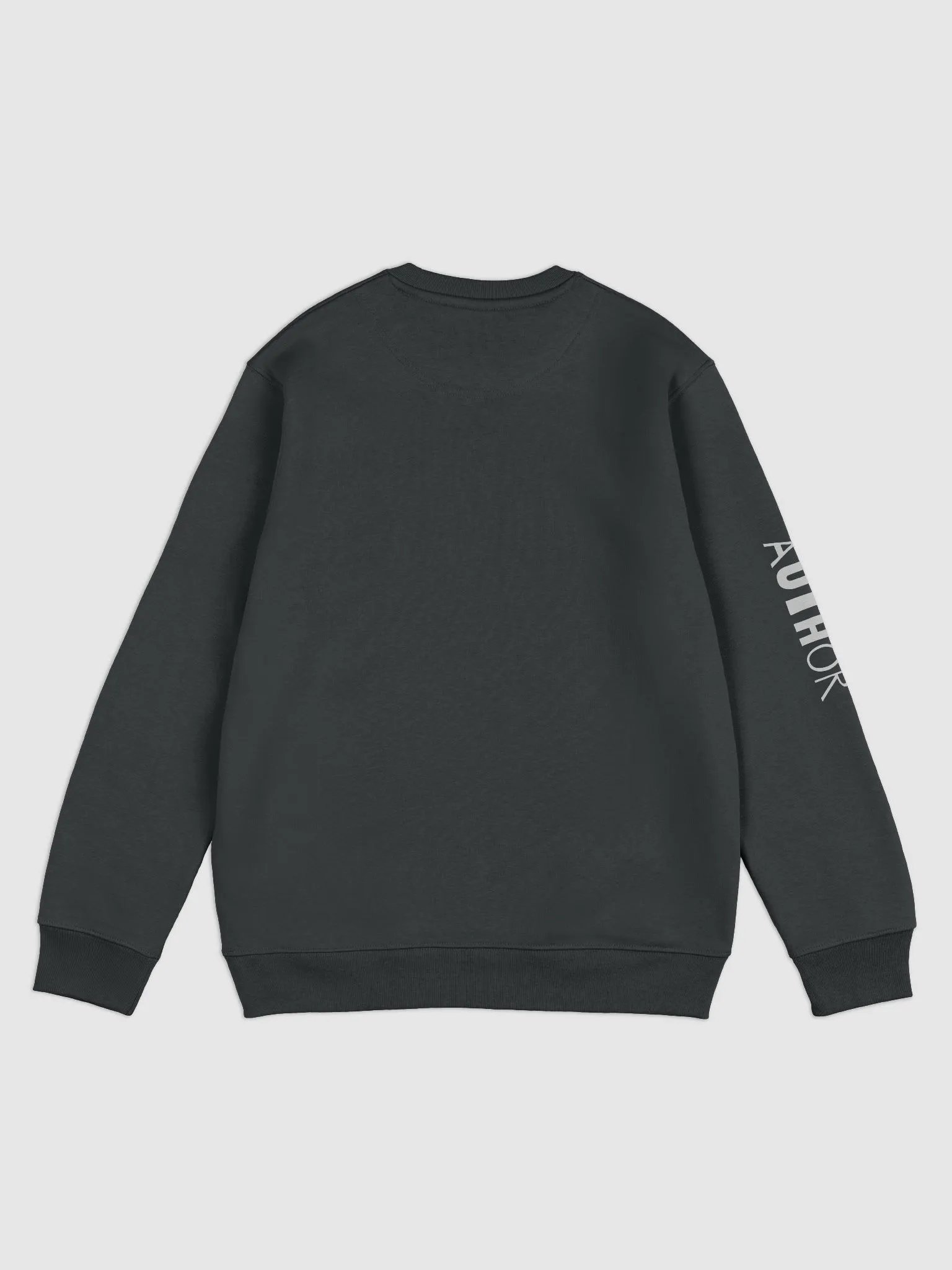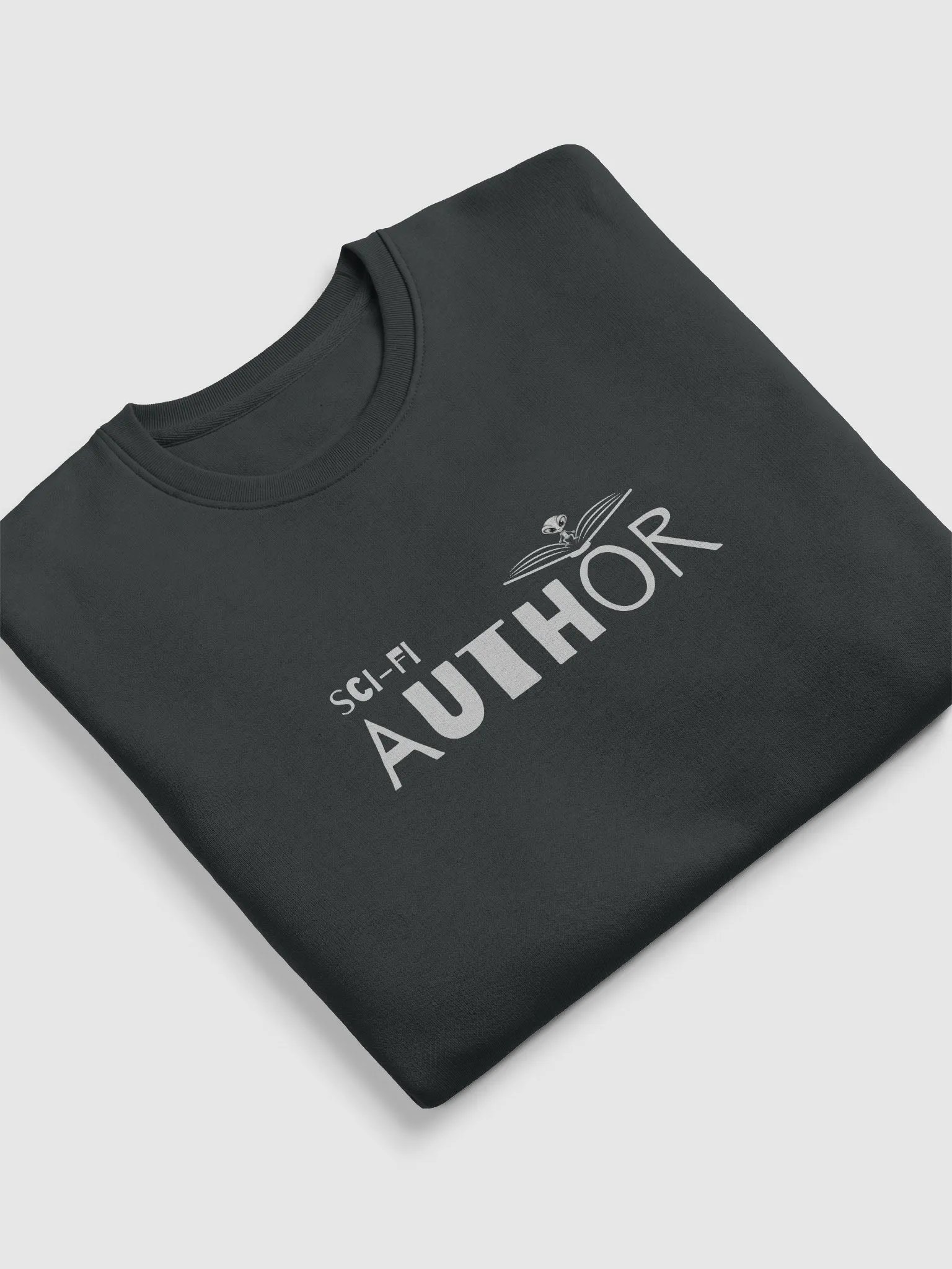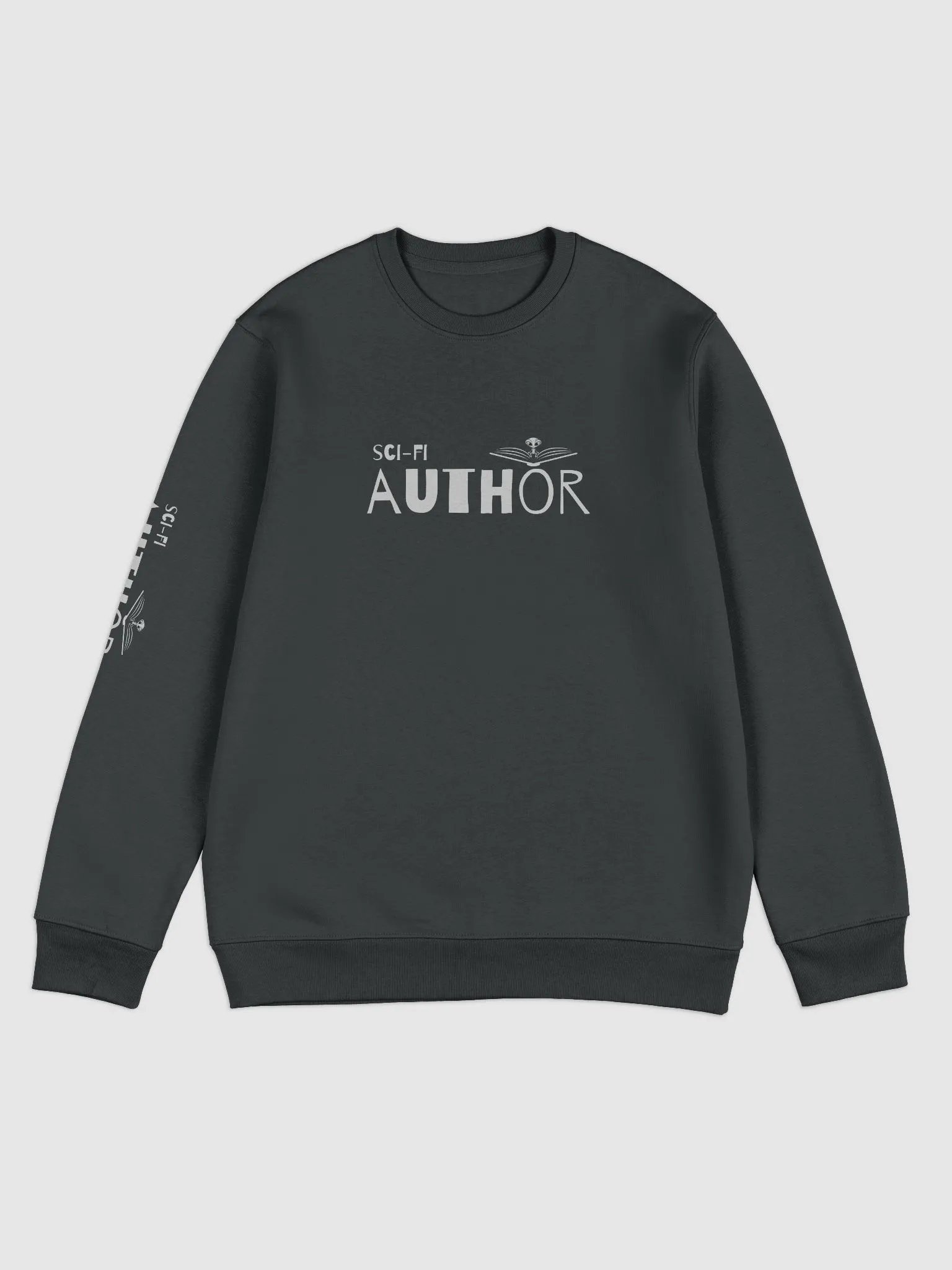 Sci Fi Author Unisex Sweatshirt - silver text on front and right sleeve with an alien on an open book motif.